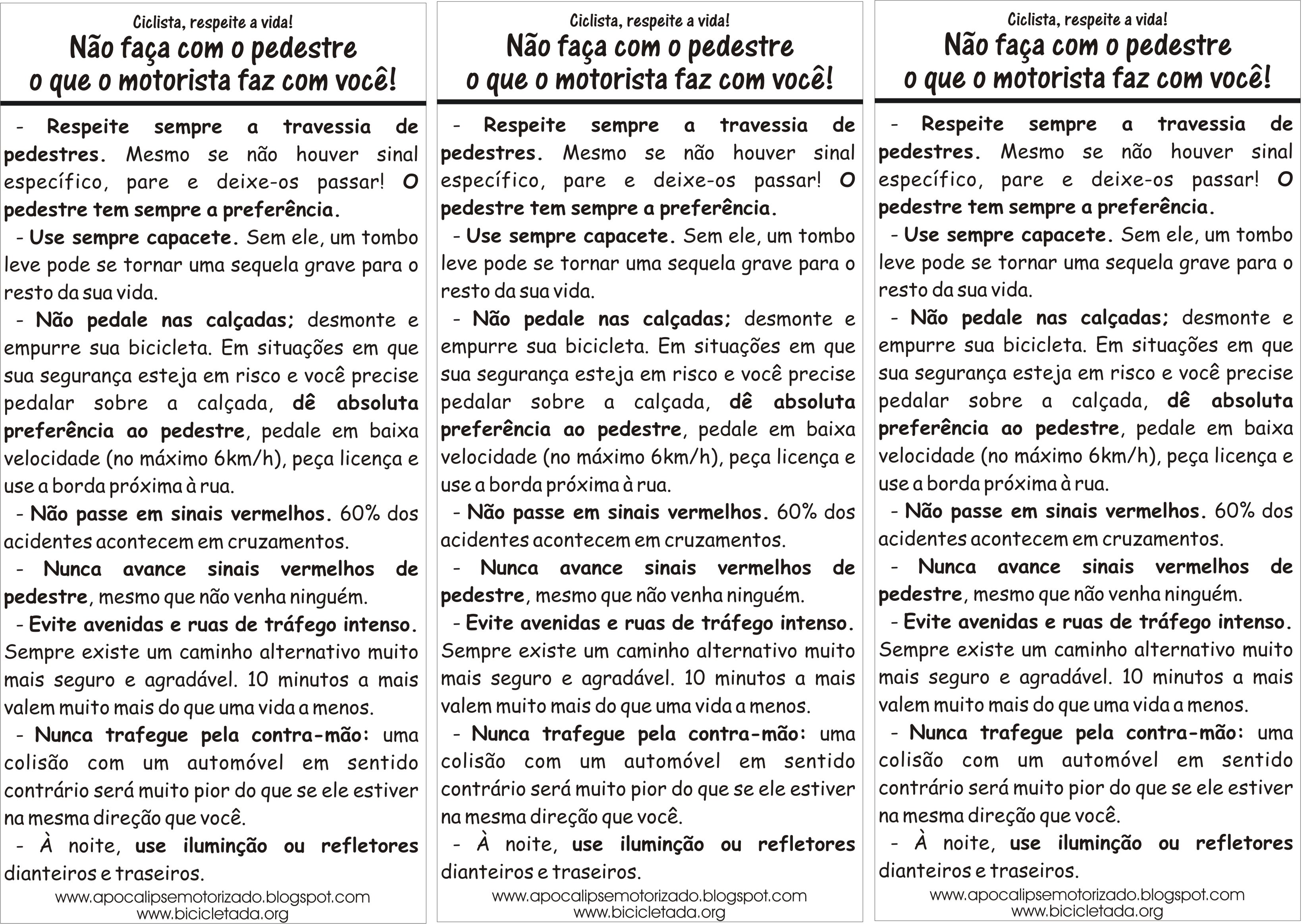 Aproveitamos para disponibilizar o panfleto “Não faça com o pedestre o que o motorista faz com você” [ver JPG], destinado a ciclistas (atletas ou não) que acabam embarcando na lógica do mais forte e desrespeitam a parte mais fraca do trânsito: o pedestre.