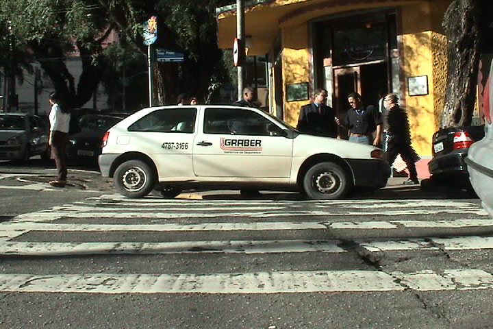 O negócio mais próspero em São Paulo é a indústria da segurança privada. Em simbiose com a indústria do medo (TV, jornais e “revistas” como a Veja), a segurança está acima de tudo na vida do paulistano. No caso da foto acima, o carro de segurança está mesmo é “em cima” da faixa de pedestres.