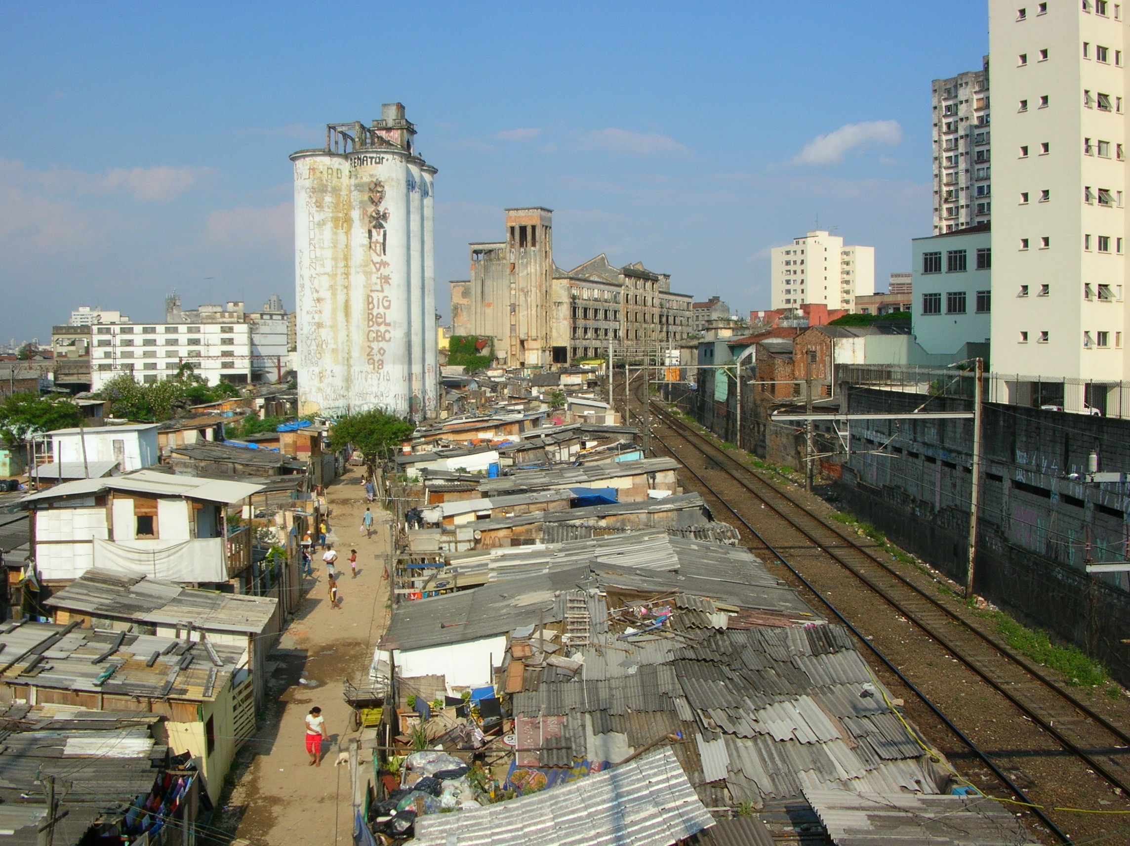 De bicicleta ou a pé, percebemos muito mais a cidade ao redor. Nunca tinha reparado nesta favela no bairro de Campos Elíseos, ao lado da linha do trem. Ao fundo, ruinas de uma velha indústria. Gente abandonada, patrimônio arquitetônico esperando a demolição, transporte ferroviário sucateado.