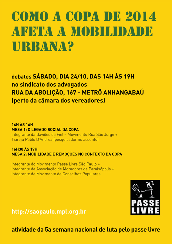 Neste sábado (24), das 14h às 19h, o Movimento Passe Livre promove um debate sobre mobilidade urbana e gentrificação no contexto da Copa do Mundo de 2014.