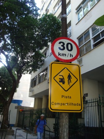 Tão simples, tão eficiente: veículos motorizados em baixa velocidade são menos perigosos. Ruas compartilhadas: a solução mais moderna e barata para estimular a mobilidade urbana inteligente. Em Copacabana, Rio de Janeiro, boa parte das ruas já recebeu estas placas.