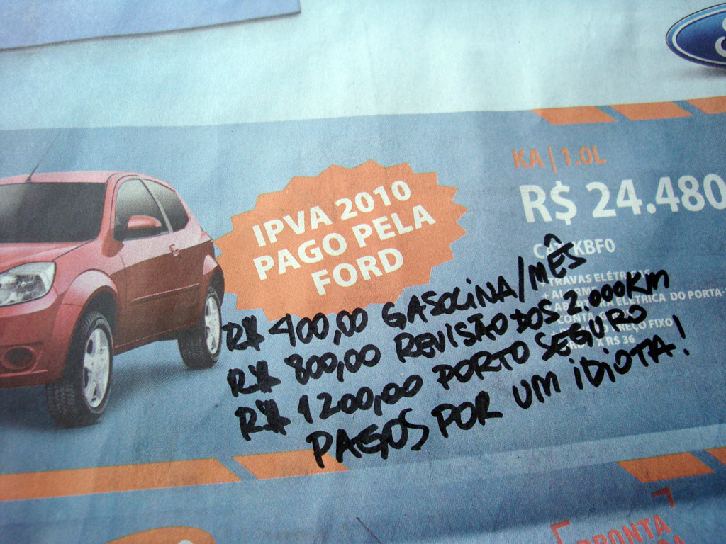 Fábio… só espero que vc tenha escolhido bem. Algumas cidades que era paraísos quase sem engarrafamentos e tráfego, estão virando uma zona com esta redução do IPI. Minha mãe que não ia a João Pessoa tem quase um ano, foi semana passada e ficou surpresa com o trafego, os engarrafamentos, etc. Na hora lembrei: IPI ZERO!… Socorrer o parque automobilistico, garantindo milhares de empregos, em detrimento da qualidade de vida de milhões de brasileiros: este é o nosso governo! Pior que não creio que se fosse outro faria diferente. Todos querem mesmo é se locupletar, como diria Justo Verissimo!!!