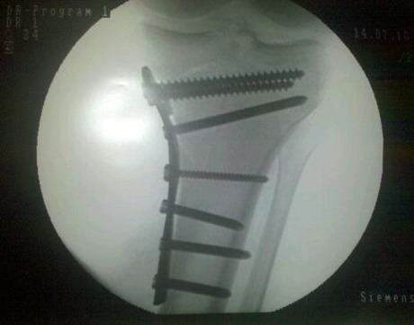 Os meus sete parafusos de titânio estão no pé.