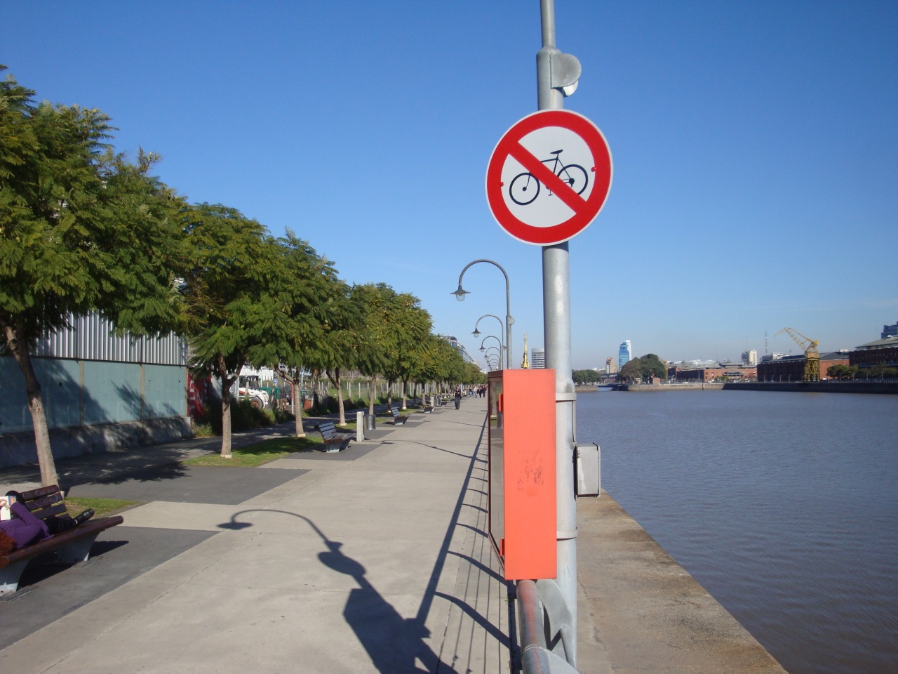 Surpreendentemente, a área livre de carros às margens do rio é proibida para ciclistas, que são obrigados a trafegar junto com os carros na rua paralela, uma via sem graça e coberta pela sombra dos prédios.